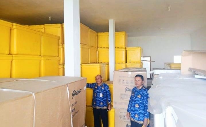 Terlihat Pegawai DKPP Ketapang bersama barang pengadaan Coolbox dan Freezer di salah satu gudang di Ketapang..poto Istimewa.