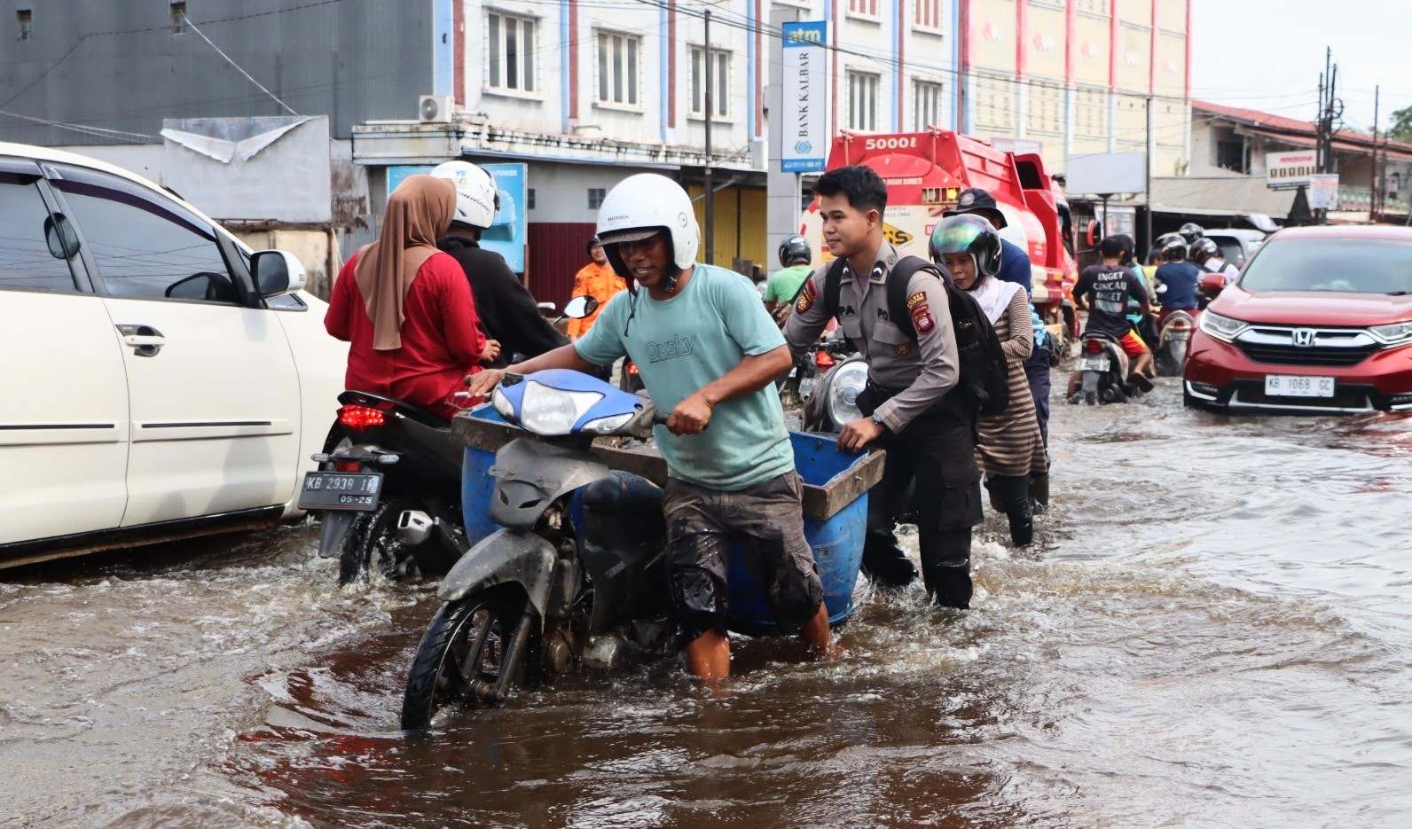Para pengendara terpaksa mendorong sepeda motor mereka ke wilayah yang tak tergenang air dengan dibantu beberapa anggota Polres Ketapang. Kondisi ini sempat membuat arus lalu lintas terganggu, serta menyulitkan warga yang hendak melintas.